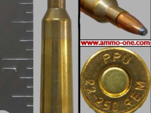 .22-250 Remington by prvi paritzan, with “PPU” H/S, 55 gr. JSP, One Cartridge, not a Box.