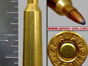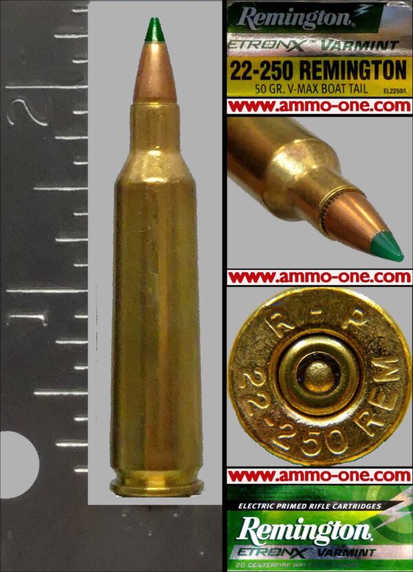 One Cartridge, not a box: .22-250 Remington “Etronx” Electric Primed” by Remington Arm Company, using Remington brass cases with “R-P 22-250 REM” Head-Stamp and loaded with a 50 grain V-MAX, PCJHP (Plastic Covered Jacketed Hollow Point) projectile.