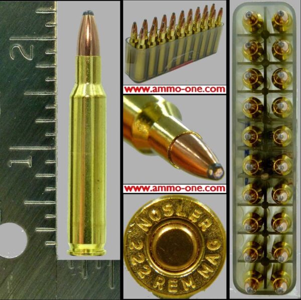 One Cartridge, not a Box: .222 Remington Magnum, “New” (special run) factory loaded, with a 50 grain JSP (Jacketed Soft Point) projectile loaded on Nosler new brass with a “NOSLER 222 REM MAG” head-stamp and copper primer. This is NOT 222 Remington, and NOT .223 Remington! No longer being produced.