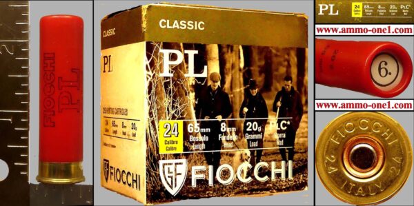 One Cartridge not a Box, 24 Gauge Shotgun shell, by Fiocchi of Italy, Newer, Modern, Red Plastic Case, Number 6 shot with “FIOCCHI 24 ITALY 24” Head-Stamp. See picture for printing on the red plastic case.