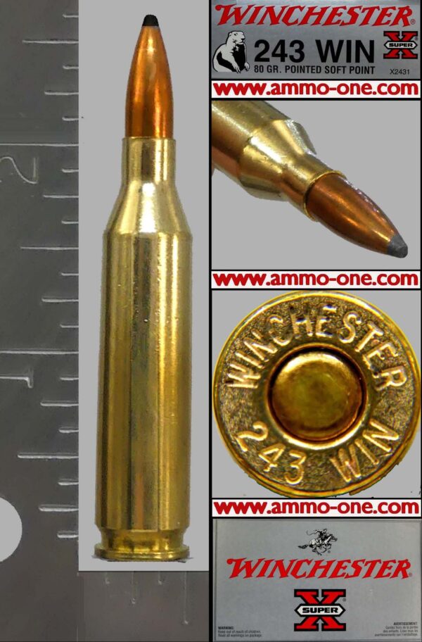One Cartridge, not a box: .243 Winchester by Winchester, factory loaded with new Winchester Brass cases with “Winchester 243 WIN” Head-Stamp and loaded with a 80 grain, JSP (Jacketed Soft Point) projectile.