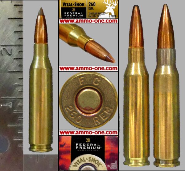 One Cartridge, not a box: .260 Remington “VITAL-SHOK” by Federal Cartridge Company, factory loaded using new Federal brass cases with ” F C 260 REM” Head-Stamp and loaded with a 120 grain Nosler “Ballistic Tip” or PCJHP (Plastic Covered Jacketed Hollow Point) projectile.