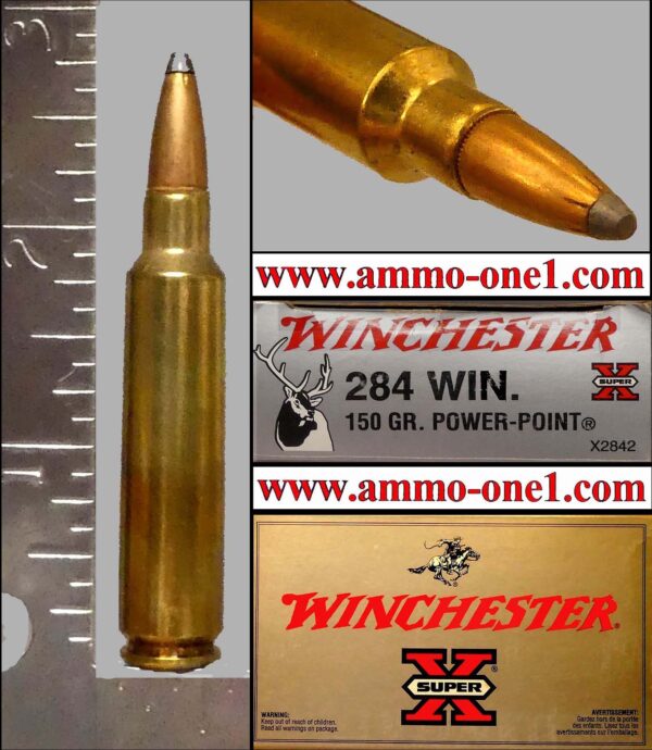 One Box of 20 Cartridges: .284 Winchester by Winchester, factory loaded with new Winchester brass cases loaded with a 150 grain Power-Point or JSP (Jacketed Soft Point) projectile.