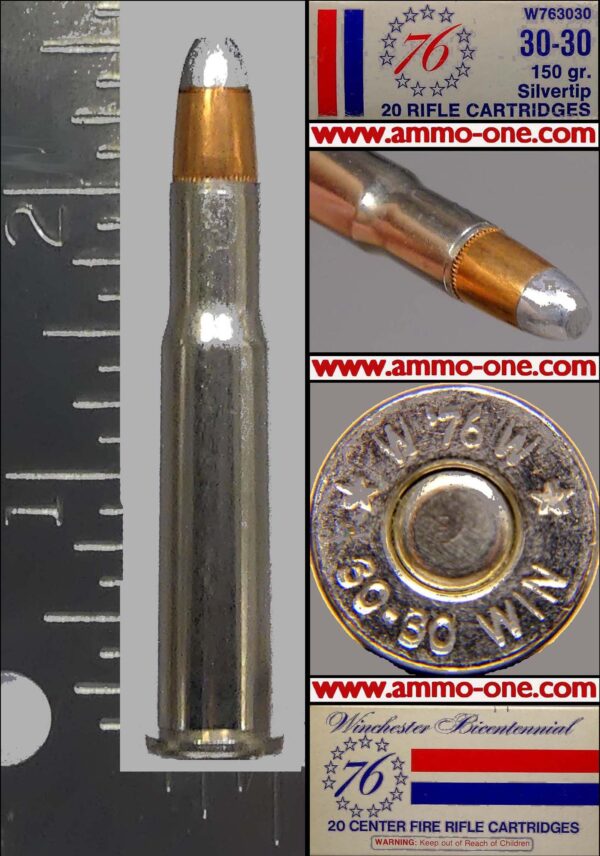 One Cartridge, not a box: .30-30 Winchester.Winchester’s 1976 Limited Edition , Special Run of 30-30s for the USA’s Bicentennial, 1776-1976, 200 year anniversary of the USA. Special Run using (then New) Winchester Nickel plated brass cases with a special “* W’76W * 30-30 WIN” Head-Stamp and loaded with a 150 grain Winchester “SILVER TIP” JSP ( Jacketed Soft Point) projectile.