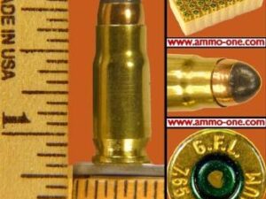 One cartridge, not a box: .30 Luger or 7.65mm Parabellum by Fiocchi of Italy produced with new Fiocchi brass case with “G.F.I. 7.66 Parabellum” Head-Stamp, loaded using new with a 93 grain JSP (Jacketed Soft Point) projectile.