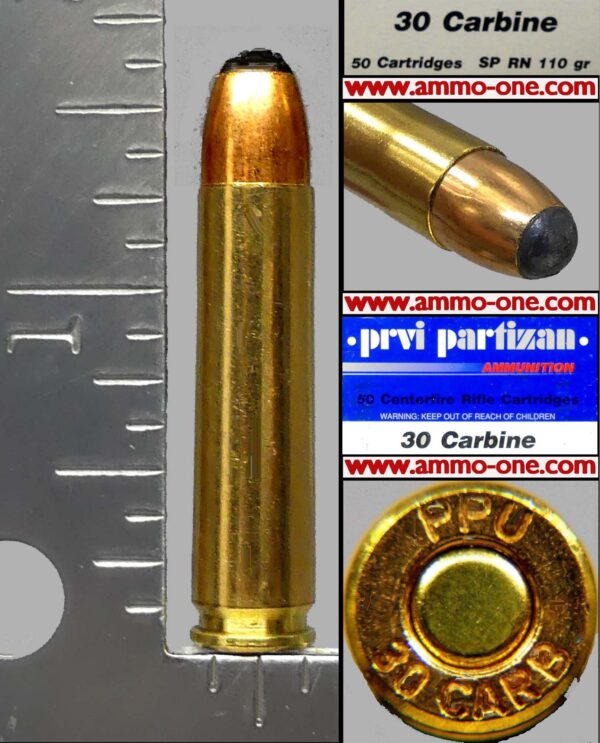 One Cartridge, not a box: .30 Carbine or .30 M1 Carbine by Prvi Partizan of Serbia, factory production using new brass cases with “PPU 30 CARB” Head-Stamp and loaded with a 110 grain FMJ (Full Metal Jacketed) projectile.