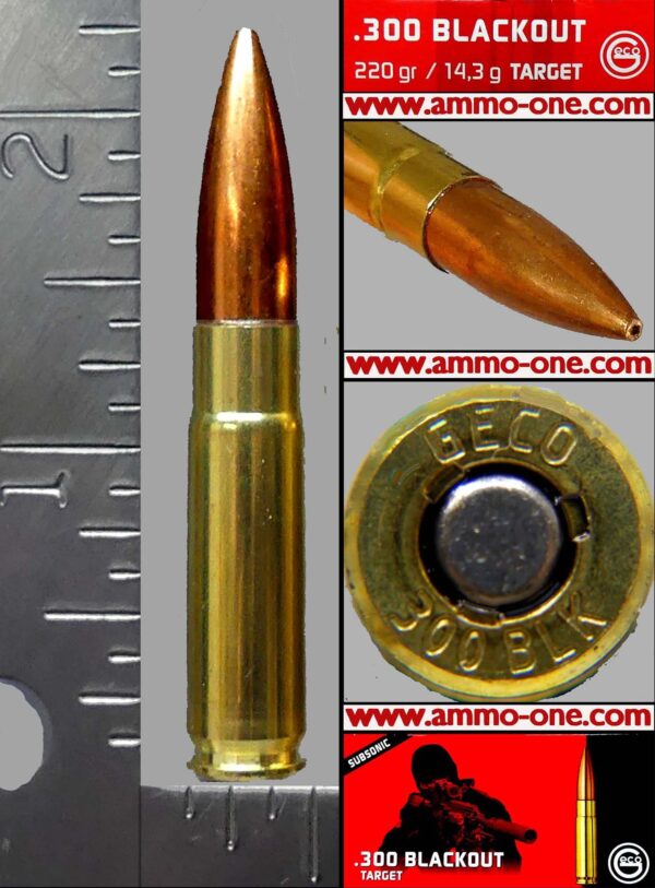 One Cartridge, not a box: .300 ACC Blackout by Geco Brand by RUAG Ammotec USA Inc., factory produced using new Geco brass cases with “GECO 300 BLK” Head-Stamp and loaded with a 220 grain JHP (Jacketed Hollow Point) projectile.