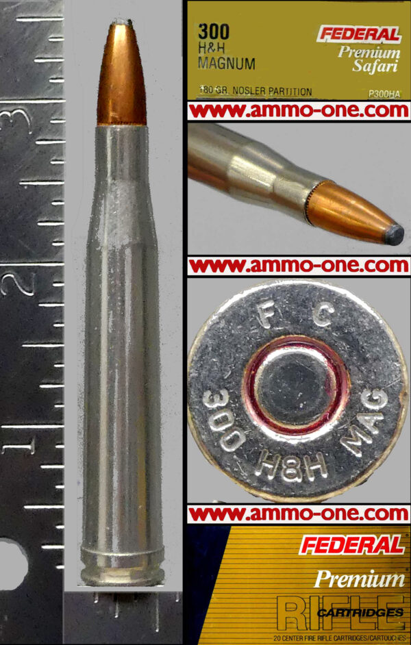 One Cartridge, not a box: .300 H&H Magnum, Belted Rimless. Older Factory production of “SAFARI” Brand by Federal Cartridge Company using new Federal Nickel Plated brass cases with “F C 300 H&H MAG” Head-Stamp and loaded with a now obsolete 180 grain Nosler Parition JSP (Jacketed Soft Point) projectile.