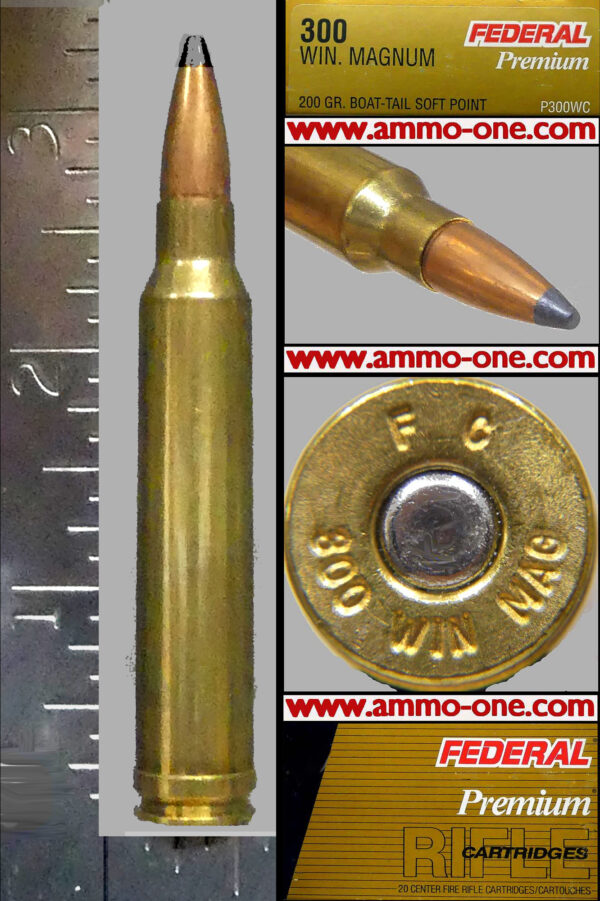 One Cartridge, not a box: .300 Winchester Magnum by Federal Cartridge Company, factory new, but older production using (then) new Federal brass cases with the “ FC 300 WIN MAG” Head-Stamp and loaded with a 200 grain JSPBT (Jacketed Soft Point Boat-Tail) projectile.