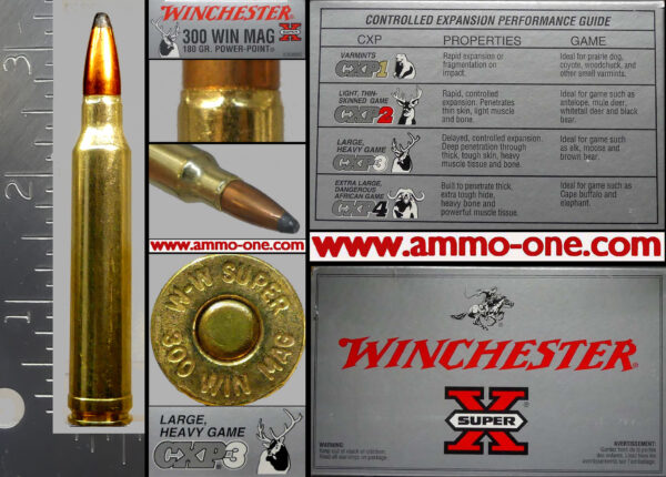 One Cartridge, not a box: .300 Winchester Magnum produced by Olin Corp. under Winchester Brand, factory loaded using (then) new Winchester brass cases with the “ W-W SUPER 300 WIN MAG” Head-Stamp and loaded with a 180grain PowerPoint CXP3 (see Pictiue) JSP (Jacketed Soft Point) projectile, with an extremely heavy crimp. See the picture of 4 different CXP projectiles explained in above picture.