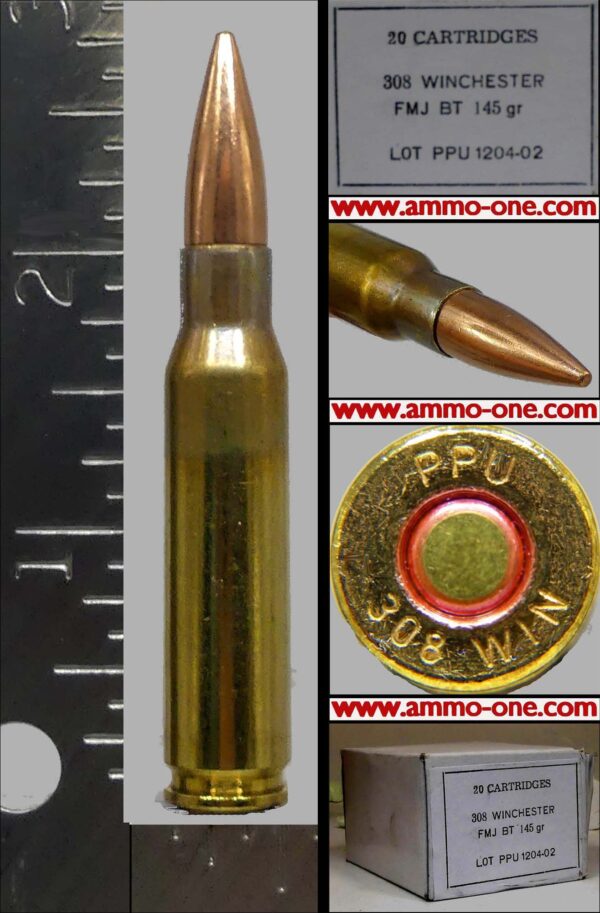 One Cartridge, not a box: .308 Winchester, factory loaded by Prvi Partizan (PPU) of Serbia using new PPU brass cases with “ PPU 308 WIN” Head-Stamp loaded with a 145 Grain FMJ (Full Metal Jacket) projectile.