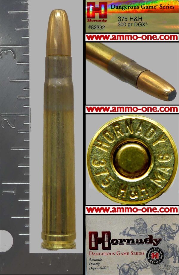One Cartridge , not the Box! : .375 Holland & Holland, rimless, by Hornady USA, using new Horandy brass cases with “HORNADY 375 H&H MAG” Head-Stamp and loaded with a 300 grain Hornady DGX®* or JSP ( Jacketed Soft Point) projectile.