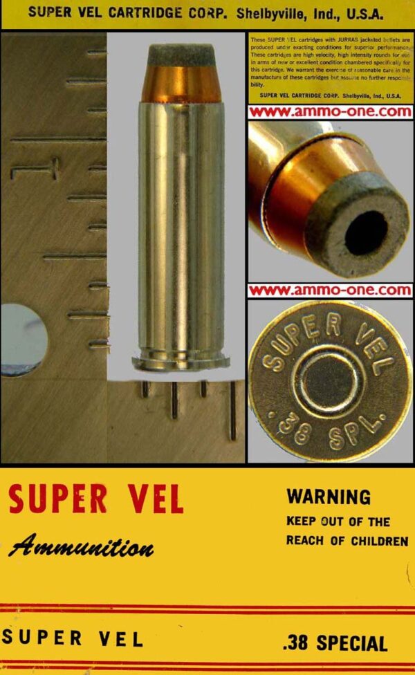 One Cartridge, not a box: .38 Smith & Wesson Special a/k/a .38 Special, SUPER VEL BRAND produced by Super Vel Cartridge Corp. in Shelbyville, Indiana; the first company to produce the Super Vel brand. Loaded with nickel plated brass cases and a 110 grain extremely deep JHP (Jacketed Hollow Point) projectile. “SUPER VEL .38 SPECIAL+P” Head-Stamp.