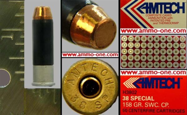 One Cartridge, not a box: .38 S&W Special “Black Composite Case” embedded in an Aluminum base or head and loaded with a 158 grain FMJ (Full Metal Jacket) projectile produced by Amtech International, Inc.of Cour D’Alene, Idaho. Please note: a very few boxes available, put “Amtech” in seach products or check below in related items.