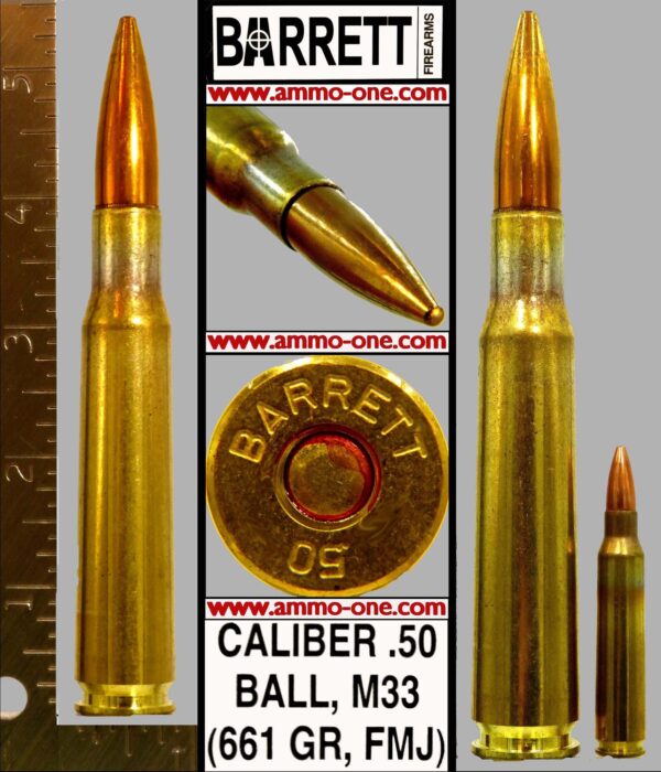 One Cartridge not a box: .50 BMG (.50 Browning Machine Gun) Newly produced by Barrett Firearms, USA using New Brass cases with “BARRETT .50″ Head-Stamp and loaded with a 661grain , M33, (Soft Steel, Jacketed) FMJ (Full Metal Jacketed Projectile, and red primer sealant. LIVE AMMO. No Sales to California.