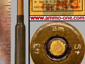 During the second world war the ball rounds were also produced by the Austria Arms-Manufacturing Company in Hirtenberg, Austria under German occupation at the time they production. with a steel case (with “am” factory code on the headstamp) and a gilding metal clad steel jacketed bullet. Later also copper nickel jackets were used.Production of steel cased cartridges was also done by FN in Belgium (with “ch” headstamp code). The steel cased cartridges were used in captured M95 rifles, Swartzlose machineguns (M.08) and Lewis machineguns (M.20)