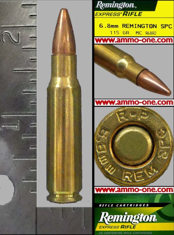 One Cartridge, not a box: 6.8 Remington SPC (SPC for Special Purpose Cartridge) factory produced by Remington Arms, Company LLC for commercial use, using new factory brass cases with “ R-P 6.8 REM SPC” Head-Stamp and loaded with a Remington 115 grain MC or FMJ (Full Metal Jacket) projectile, and regular copper primer.