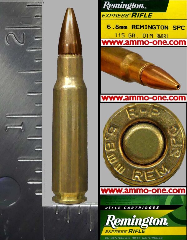 One Cartridge, not a box: 6.8 Remington SPC (SPC for Special Purpose Cartridge) factory produced by Remington Arms, Company LLC for commercial use, using new factory brass cases with “ R-P 6.8 REM SPC” Head-Stamp and loaded with a Remington 115 grain OTM or JHP (Jacketed Hollow Point) projectile, and regular copper primer.