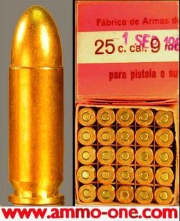 One Box of 25 Cartridges: 9mm Largo by S&B, (Santa Barbara , Madrid, Spain) with Berdan Primed, Brass Cases. with Corrosive primers, Full Metal Jacket projectiles.